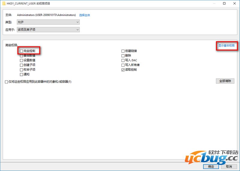 这时就会回到HKEY_CURRENT_USER的高级安全设置窗口,我们在这个窗口,点击:显示高级权限;在HKEY_CURRENT_USER的权限项目窗口的高级权限下,点击:完全控制,再点击:确定;