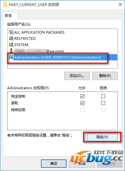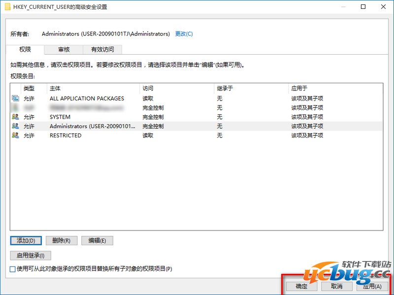 回到HKEY_CURRENT_USER的高级安全设置窗口,点击:应用 - 确定;