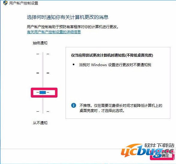 再把小滑块拖到如下图位置:仅当应用尝试更改我的计算机时通知我(不降低桌面亮度)- 当我对Windows设置进行更改时不要通知我,再点击确定;