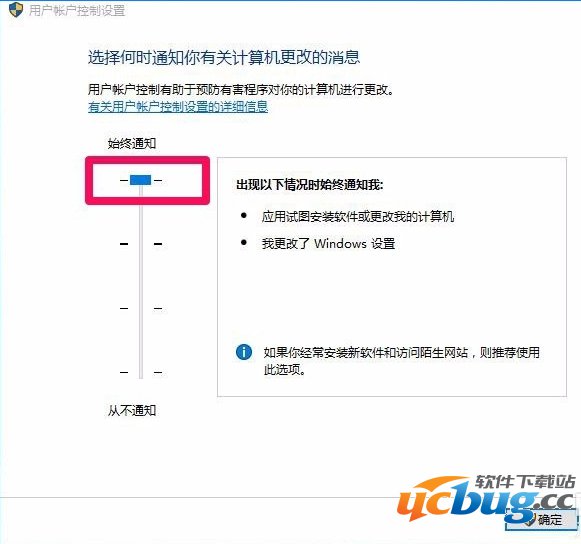 在用户帐户控制设置窗口,我们可以看到调整通知的小滑块处于“始终通知”位置;