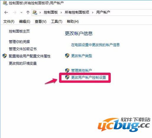 在打开的用户帐户窗口,点击:更改用户帐户控制设置;