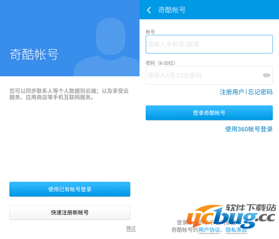 3、登陆奇酷账号。如已有奇酷账号或360账号可选择【使用已有账号登陆】。如果没有,点击【快速注册新账号】。也可点击【跳过】,跳过此步骤。
