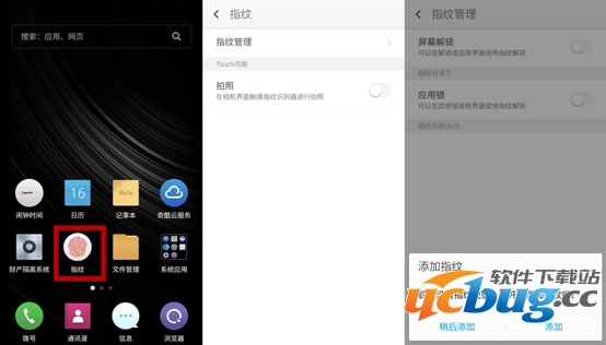 8、指纹功能是360奇酷手机的卖点之一。点击进入后可选择除了【指纹解锁】功能外是否开启【指纹拍照】功能。点击【指纹管理】添加新指纹。