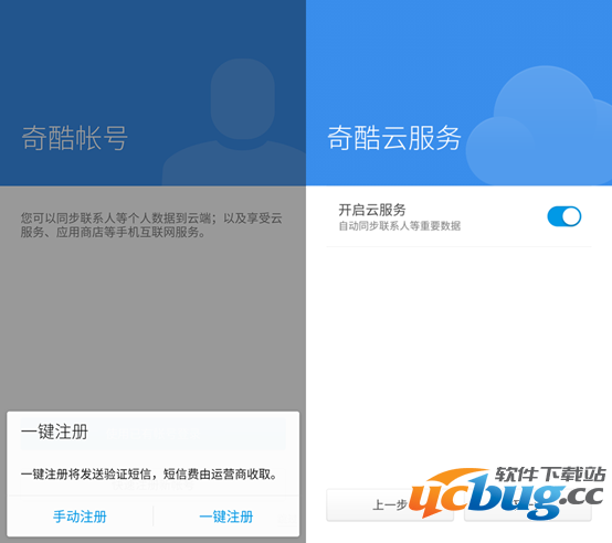 登陆之后,可选择是否开启奇酷云服务,开启后,奇酷云端会自动同步手机中的联系人、照片等重要数据,以免误删。