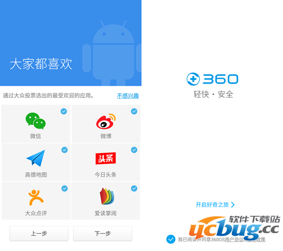 4、设置完账户进入下一步,系统会向用户推荐通过大众投票选出来的最受欢迎应用,包括微信、微博、今日头条等。可选择自己喜欢的应用,之后系统会将该应用下载安装至手机。如想跳过此步骤,点击【不感兴趣】。设置完成后,进入手机主界面。