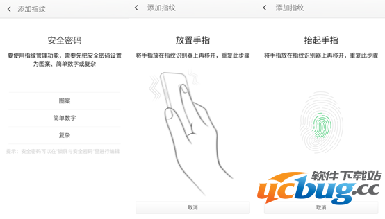添加新指纹首先需要设置安全密码,方面指纹识别有误后,帮助解锁或密码找回。可选择解锁图案、简单数字或数字字母组合的复杂密码。