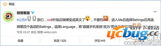 微博客服也公布了应对此问题的方法,“进入Me后选择Settings后再选择第四个选项的Settings,选择Language,将‘跟随手机系统’改为'简体中文’即可”。