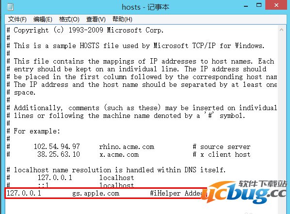 用记事本或写字板打开hosts文件,在最下面有一行“127.0.0.1 gs.apple.com #iHelper Added”删除这行即可。