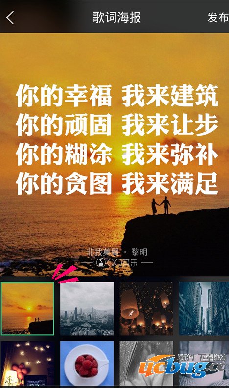 设置好歌词海报怎么发布和保存呢?点击右上角的[发布],既可以分享给QQ好友,微信朋友圈,微博等社交,同时会生成图片保存到手机上。