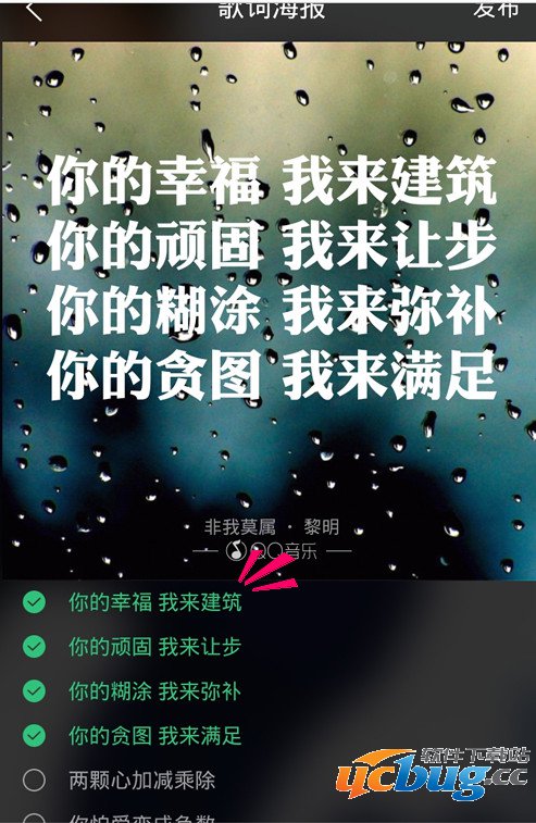 歌词海报的主角当然是歌词了,所以当你选择一首歌曲之后,重点是选择歌词,被你选择的歌词会显示到海报的中间,当然歌词可以选择一句也可以是多句。