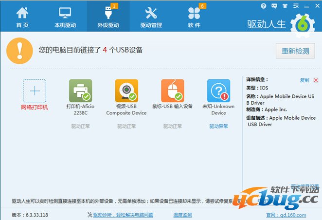 点击打开外设驱动界面,可以看到,电脑所有外部接入的usb输入设备,都会出现在了这个界面。点击某个设备,都可以查看设备的信息,对于外设设备的管理方便、快捷。如某个外设设备驱动出现异常,都会有相应提示。如iPhone 6S插入电脑识别不了时,即会有感叹号提示,只需点击“修复驱动”,根据相应提示操作即可。