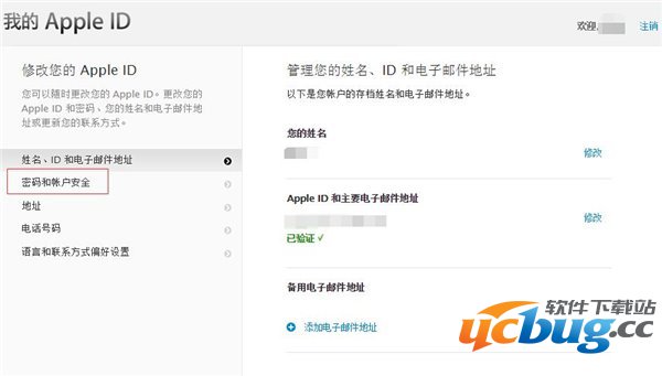 4.登陆之后,我们将看到自己的账户个人信息,在左侧对话框中选择“密码和账户安全”,这时候,页面中将会显示我们之前所设定的安全提示问题,若想要涉及Apple ID的帐户安全操作时,必须要输入事先设置的正确答案。很显然,这个答案就是我们今天要找回的内容。