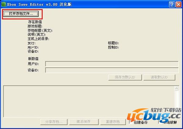 1.打开Xbox Save Editor如下图,选择“打开存档文件”,找到你自己的存档,确定,此时“用户id”“设备id”都读出了数据,选择 ”保存为默认id“,弹出对话框点“确定”。