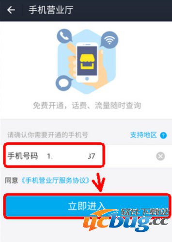 第三步:在手机营业厅这个界面,这里的手机号码是默认的我们上次刚刚充值过话费的电话号码,修改成我们需要开通的手机号码,然后点击“立即进入”