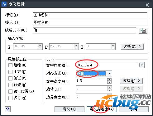 打开需要自定义的标题栏样式,把需要自动显示的内容(如公司名称)用文字做好之后,进行属性块的制作。在命令栏输入:att,将弹出的【定义属性】对话框中的标记和提示都改为:图样名称。文字样式及对齐方式的设置如下图所示,完成设置后选择“定义并退出”,然后指定到标题栏中图样名称的位置上。