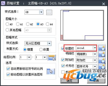 重新打开中望CAD机械版【图幅设置】,按企业标准定义好的样式“zwcad”已出现在“标题栏”选项中: