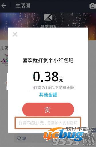 3、软件默认为1元以下随机金额,不超过一元可以不用输入支付密码,如想赏金更大,则点击其他金额,需要输入支付密码,值得提醒大家的自己不能给自己打赏