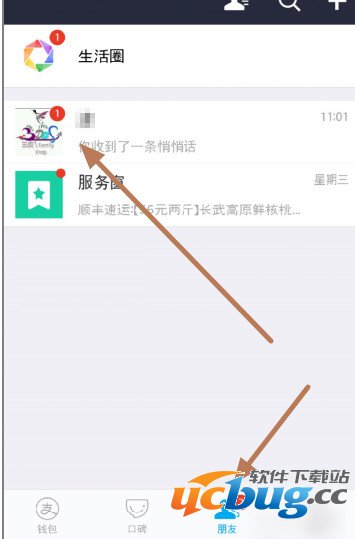 6、现在来看看对方如何查收支付宝阅后即焚的消息,点击朋友界面,可以看到“你收到一条悄悄话”