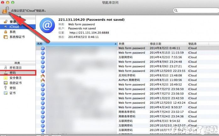 第二步:在“钥匙串访问”应用程序窗口左侧栏点选择“密码”种类。然后点击左上角的锁状图标,输入你的密码解锁。