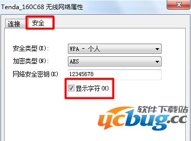 步骤三:在打开的“无线网络属性”窗口中,勾选“显示字符”项,即可查看到当前所精简的热点的密码啦。