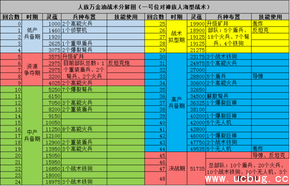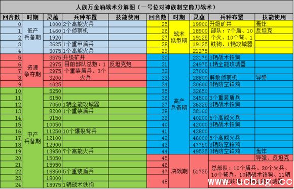 2、指挥官技能使用方面,只列出了核心施放技能的时期,其他时间根据金币情况可补充,但要确保图表里的时间段能有金币施放技能,33回合前的导弹,是在有绝杀机会的情况下,才使用,33回合后不要用导弹,否则CD转不过来,最后的导弹要确保能摧毁对方大量部队;