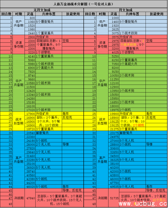 1、在不考虑中场灵蕴补给箱争夺的情况下,这套战术的兵力部署如图标,灵蕴符文的优势已经很明显,每个资源停产期的兵力都有明显提升,后面的攻略就不列出无符文加成状态下战术分解了;