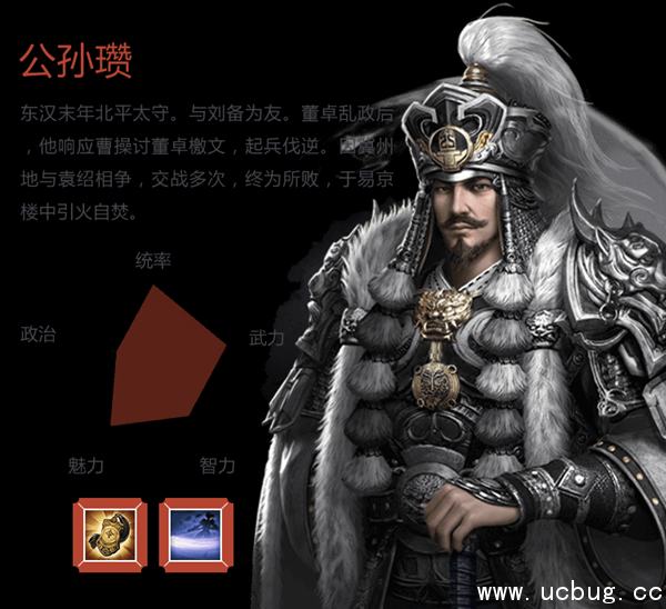字伯珪,辽西令支(今河北迁安)人,东汉末年武将、军阀,汉末群雄之一。