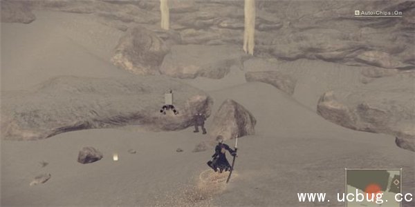 机器人妹妹就站在管道旁边的山体边,与之对话,2B和9S就会打算把她带离这片沙漠。