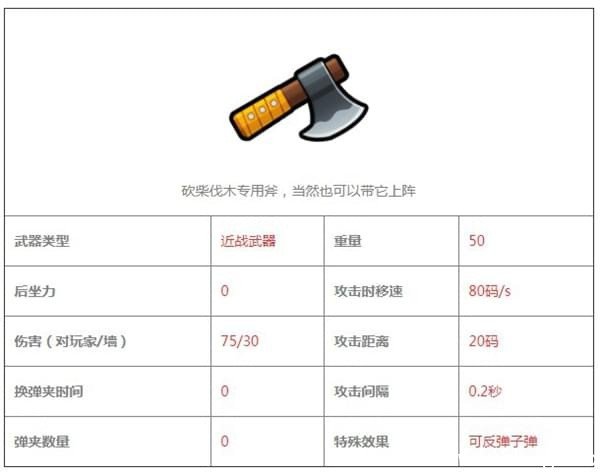 如果不是沉迷远程的话,带个战斧作为副武器在敌人近身时会有奇效。推荐在与敌人正面硬刚的模式中使用,可以轻松的砍到敌人,战斧圆形的攻击范围也可以挡住所有方向的子弹。