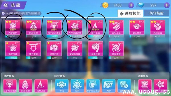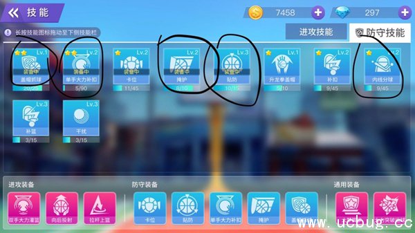 这是我平常携带的主要技能,画黑圈的为必带技能。其中盖帽抓球和单手大力补扣的发动时机可参考盖帽与篮板技巧,后面有讲到。