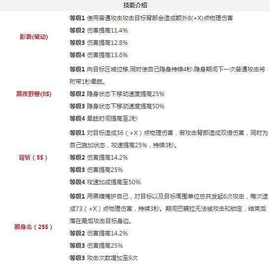 等级1 对目标造成36(+X)点物理伤害,若攻击背部造成双倍伤害,同时为自己施加状态,攻速提高25%,持续3秒。