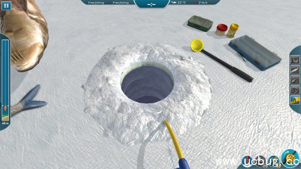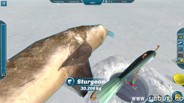 然后静等1-20秒。通常鲟鱼咬钩后会很用力的往洞里面扯。