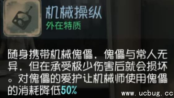 机械操控开局自带傀儡,傀儡能够代替机械师完成许多操作。机械师本体尽量不要救人(赢弱特质决定了机械师救人跟送没区别),使用傀儡救人才是正解。同时由于机械师有胆怯,在同伴受伤到达二个人的时候就要使用傀儡帮你开密码机或者门了,因为傀儡是没有任何特殊效果的,因此它不受胆怯的效果。