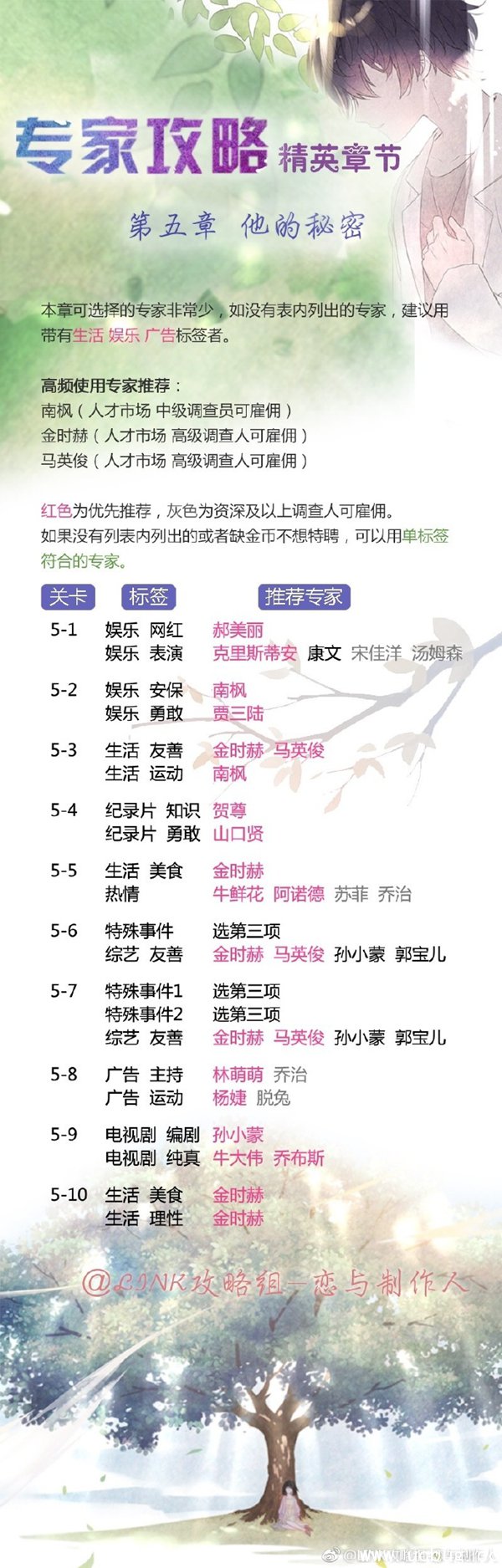 恋与制作人中各章节的专家精英关卡大家都过了吗?今天斜杠小编就为大家带来了由“LINK攻略组”分享的恋与制作人专家精英第五章攻略。