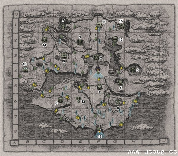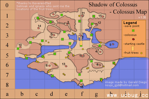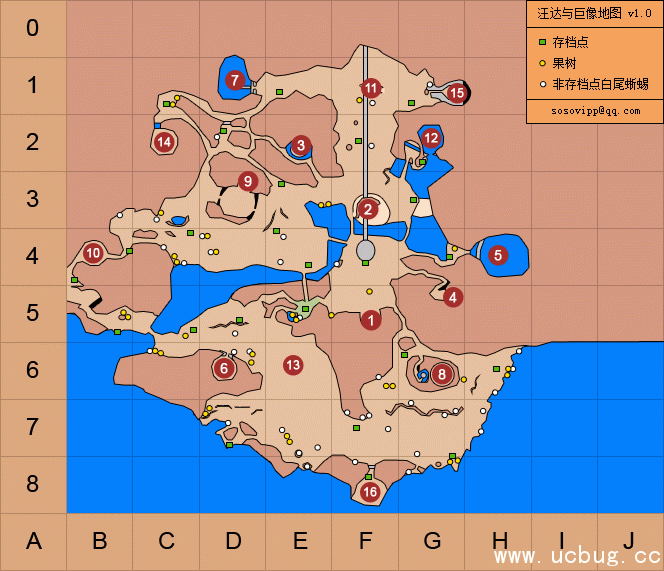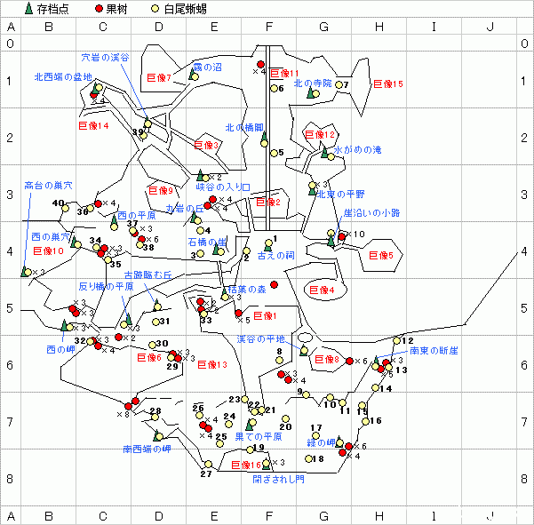 以游戏自带地图为基础,添加了巨像序号,优化了8、12、14号巨像的路线,整合了果树位置、白尾蜥蜴位置、存档点位置。