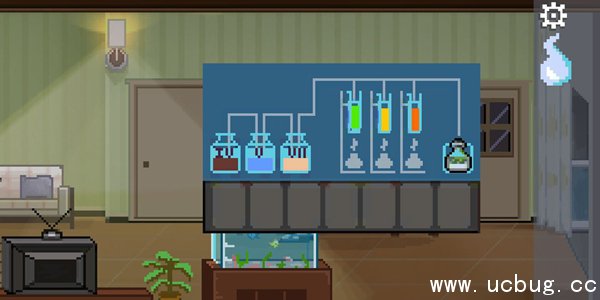 八、回到客厅:将橙汁、药、可乐放入仪器中,打开仪器,根据娱乐房中元素表提示得知比例18%、10%、3%分别为C、H 、N,对应颜色为绿、黄、橙,将三根试管放入正确位置。烧杯上有罗马数字,位置按罗马数字4、5、6摆放。将溶液放到正确位置,得到一瓶溶液。具体如下图
