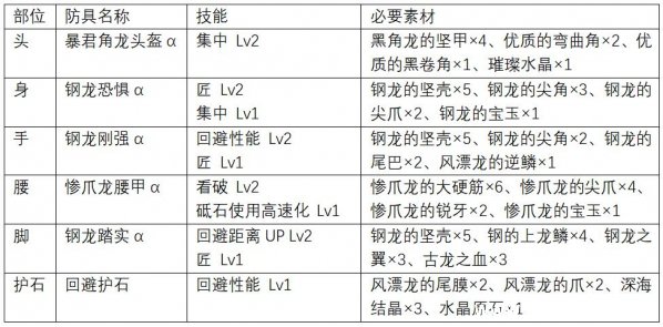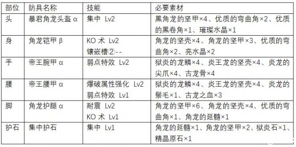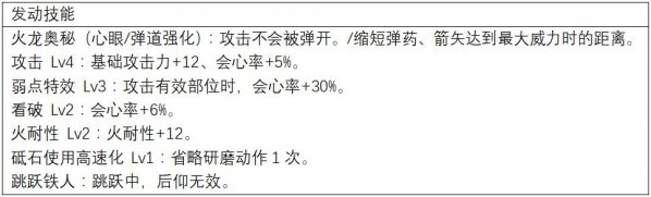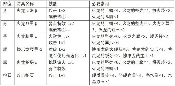 在火龙套的基础上进一步强化了攻击火力,弱点特效技能达到Lv3,命中怪物弱点时伤害非常可观。此外还有攻击 Lv4、看破 Lv2等强化攻击的技能。