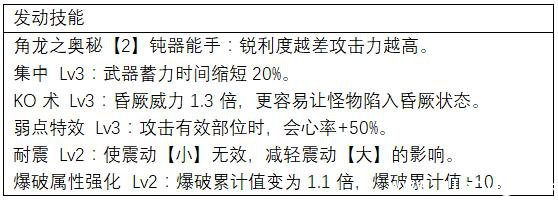 钝器能手技能可以弥补大锤武器锐利度差的通病,而集中技能则能加快大锤的蓄力速度。再配上KO术,让眩晕值积累更快,加上弱点特效,如果攻击能持续命中头部的话,怪物很快就会倒下。