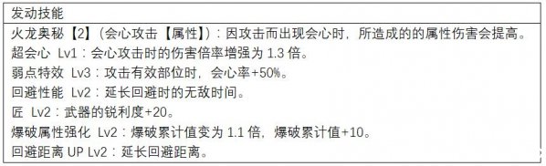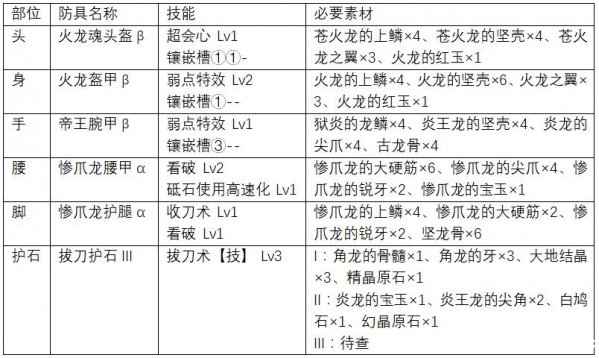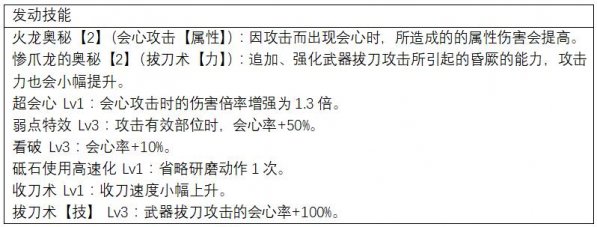 收刀拔刀是太刀的常规操作,拔刀术【力】和拔刀术【技】能有效提高伤害输出,弱点特效和看破能提高攻击会心率,超会心则提高了会心伤害,火龙两件套的技能可以在会心攻击时提高属性伤害。除此之外还有4个镶嵌槽,其中一个还是3级孔,可以通过镶珠子配上需要的技能。