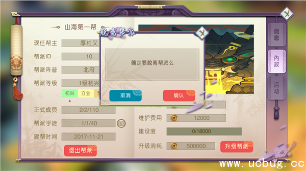 各位大人加入阵营后,就可以选择一方阵营的帮派加入了。点开“帮派”界面,和志同道合的伙伴一起,建设最强帮派吧!当大人创建或加入帮派后,点击帮派按钮即可弹出本帮内的相关信息,可以看到帮派内成员的名称、等级、职业、加入时间以及在线时间,除此之外,玩家还能够看到更多的其他帮派信息。