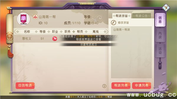 当玩家消耗一定资源成功创建帮派后,系统会向全部玩家发送世界公告,告知其他玩家,该玩家已经建立了一个帮派。创建帮派成功后,创建者即成为该帮帮主,同时会受到系统发来的提示邮件,确定您的帮主身份,此时,您就可以可以招兵买马,广招天下英豪,号召大家团结互助,共同建设自己的帮派啦!在帮派中,可以清楚地查看帮派所属阵营,帮派的等级,帮派的总成员数量和在线成员数量,还可以看到帮派中全部人员的帮派贡献度,还能看到帮派人员是否在线。
