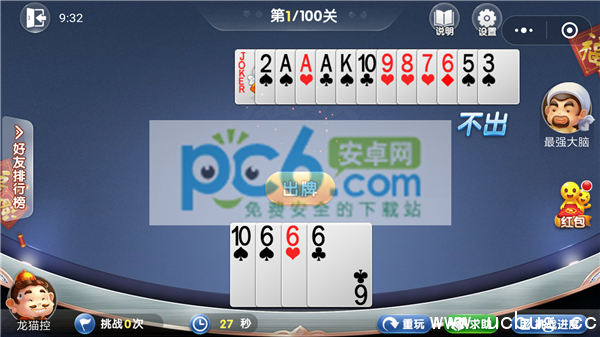 第一关牌:6、6、6、7、8、9、10、10、J
