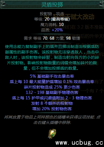 比如说如果你想提高你的物理伤害,你可以用塔盾,圆盾和轻盾,如果你想最大化这个技能的攻击暴击率你可以选择使用魔盾,此技能和影响投射物词缀也有非常有趣的效果。