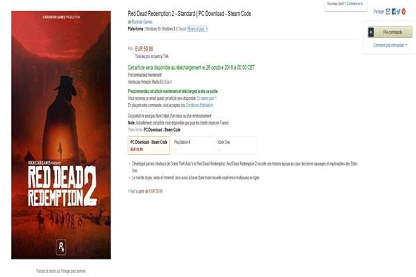 之前R星确认《荒野大镖客2》将于10月26日发售,但该作并没有登陆PC的计划。近日,法国亚马逊上线了《荒野大镖客2》预购页面,竟然显示有Steam版,难道《荒野大镖客2》将要登陆PC吗?