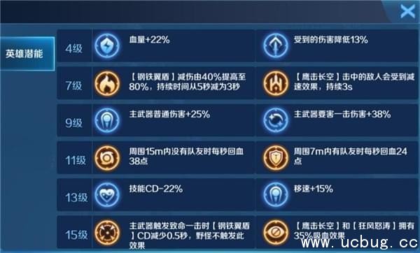 4级选择血量+22%,7级选择提升钢铁翼盾减,9级选择主武器要害一级上海+38%,11级选择15m内没有队友时每秒回血38点,13级选择移动速度+15%
