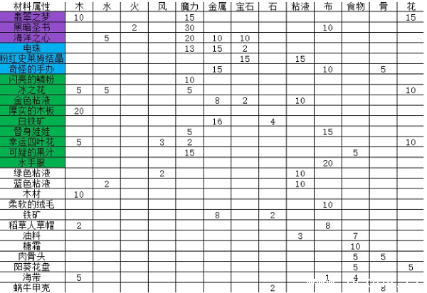 炼金材料一览: