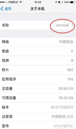进入了“关于本机”界面,此时我们发现界面的第一行名称,默认的就是该机型iPhone6,点击进入;