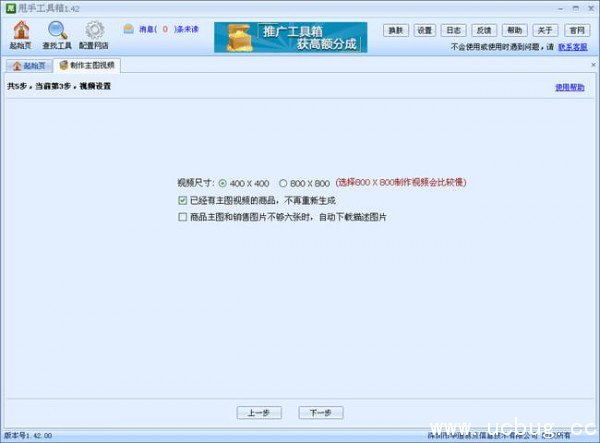 6、视频设置区:有400*400与800*800两种尺寸的视频,前者优点是制作时间短,后者优点是视频显示尺寸更大,按照自己需求来选择,现在的勾选中,可以选择排除掉店铺中已有视频的宝贝,还可以设置宝贝主图与销售图片不够6张自动选择描述中的图片来生成视频。
