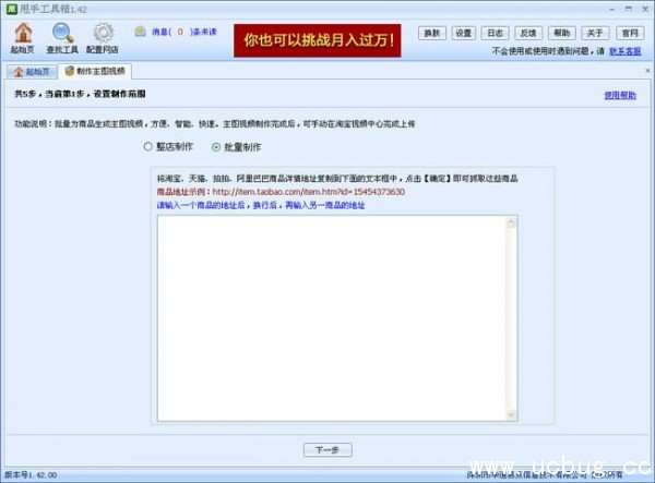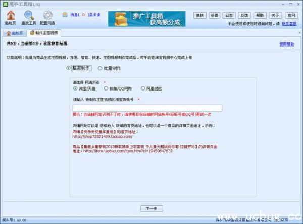 3、进入该功能后,可能看到,有有整店复制与批量制作功能,现在选择制作范围,选批量制作可批量生成不同平台的宝贝视频,可借用淘宝、天猫、拍拍、QQ网购、阿里巴巴平台中的商品作为素材批量生成出淘宝店铺中宝贝的视频;选整店制作可一键生成宝贝视频,可以批量将店铺中的所有宝贝一键制作出宝贝视频。