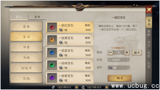 商会内出售各种类型的一级宝石,可使用绑银购买。将军可选购符合自己职业特性的宝石,比如破军职业可采购红宝石(力量)、绿宝石(体质)和紫宝石(攻城值)。